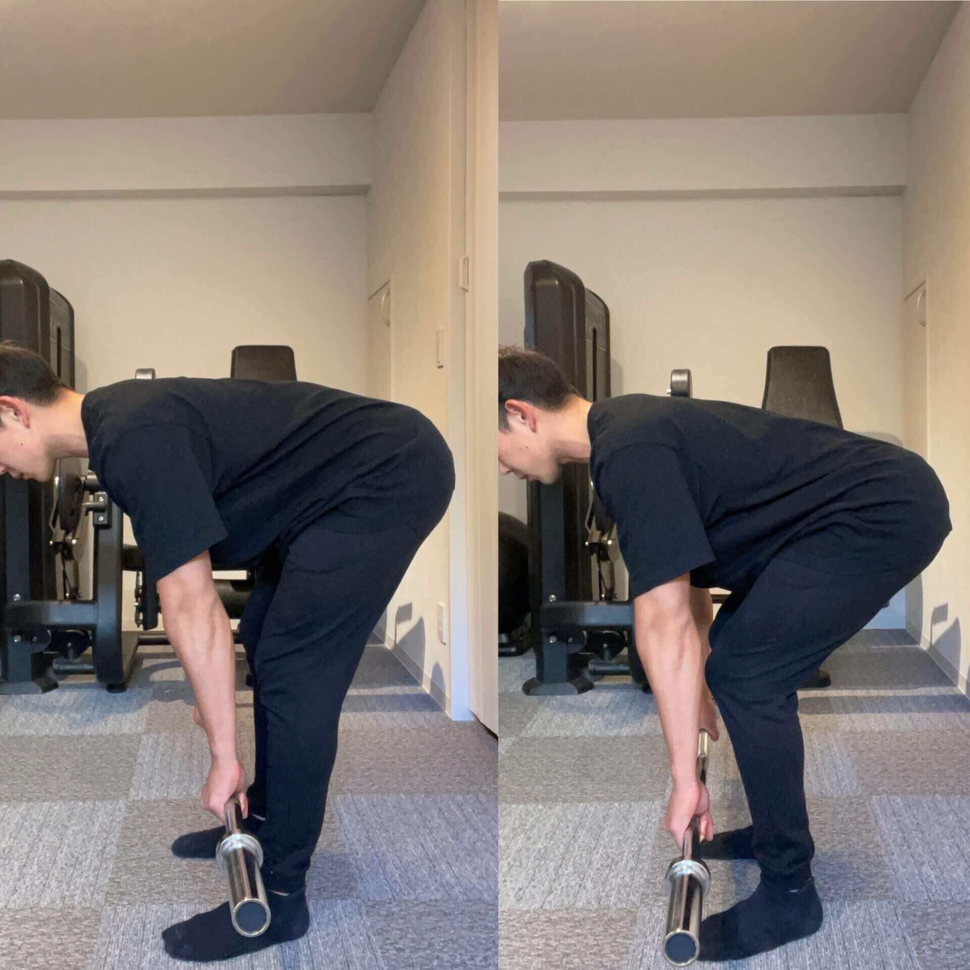 膝を少し曲げて状態を前傾するスタートポジションで、太もも裏が強烈にストレッチされます。膝を伸ばしたまま状態を、前傾するスティフレックデッドリフト(写真右)は、ハムストリングをさらに、強くストレッチできる種目です。