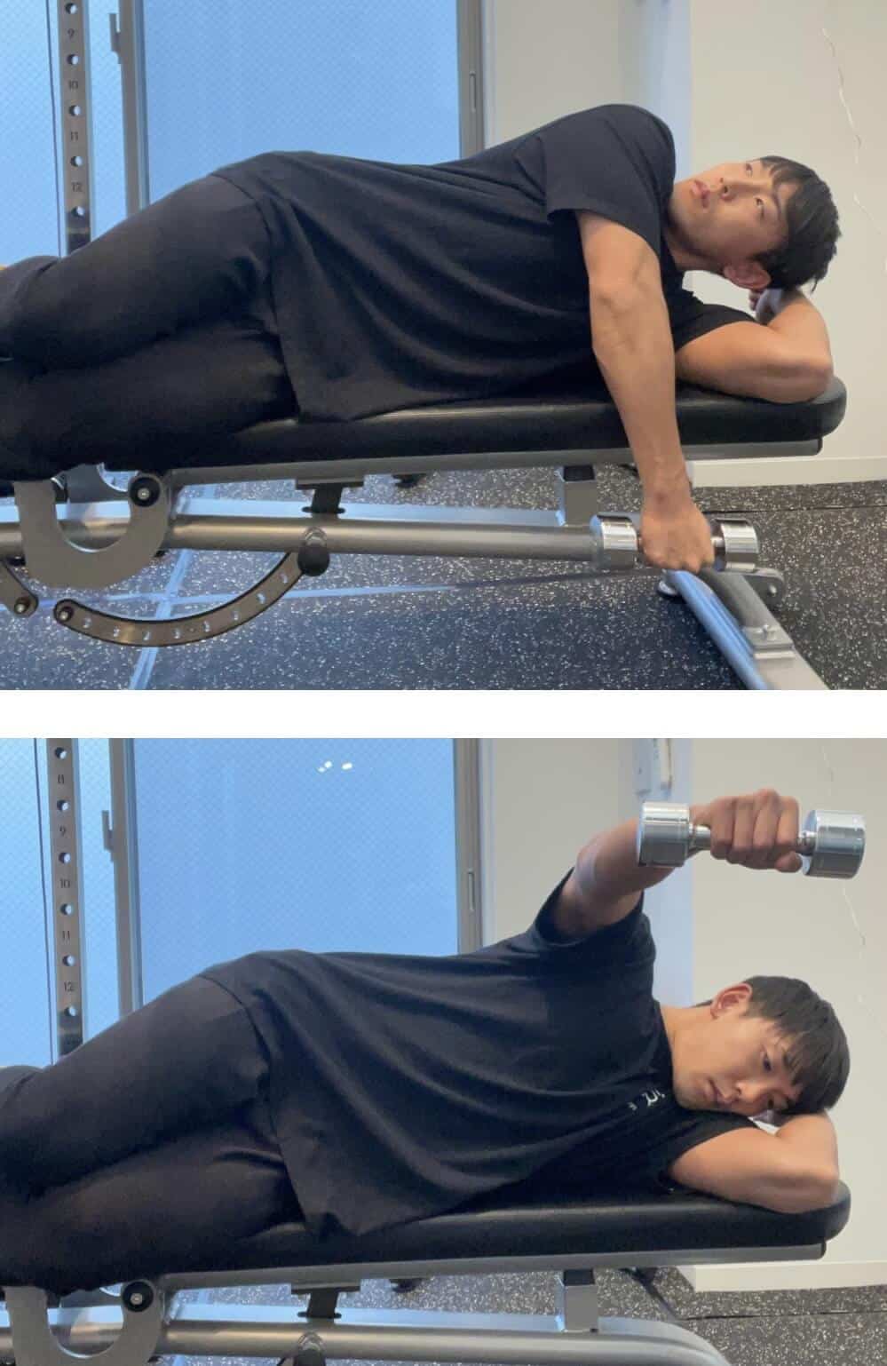 しかし横向きに寝て行うと、ダンベルをおろしても負荷が抜けなくなるため、伸長位の負荷も強くなります。